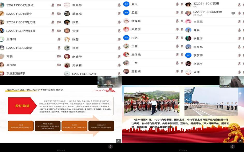 研究生党支部于5月6日晚上开展了一场习近平总书记重要讲话理论知识学习线上活动。活动由视频学习和心得分享两个部分组成,支部组织委员汤秉锦同志主持了活动,支部成员胡帅和王雅婧同志给大家分享了学习心得。