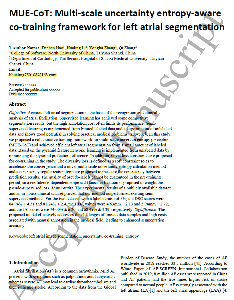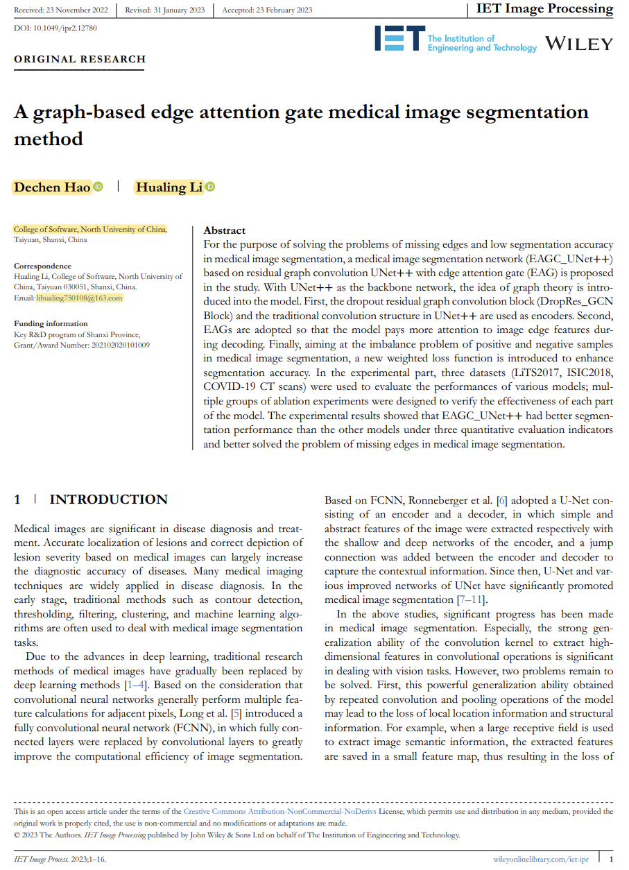 研究生郝德琛所在的李华玲副教授团队,目前正在承担山西省科技厅重大专项,在承担此项目的过程中,与山大一院、山大二院和太原市中心医院进行了非常深入的合作。由研究生郝德琛为第一作者、导师李华玲为通讯作者的论文“A graph-based edge attention gate medical image segmentation method”于2023年3月在《IET IMAGE PROCESSING》期刊发表。该研究成果发表后立即受到了全球学者们的广泛关注,在发表后的三个月内即获得了320次下载,位居该期刊中国作者第一季度发表文章三月内下载量前五,因此荣获2023年第一季度“Wiley中国开放科学高贡献作者”荣誉,这是巨乳白虎